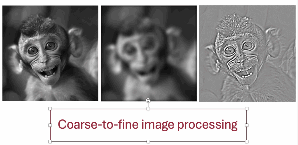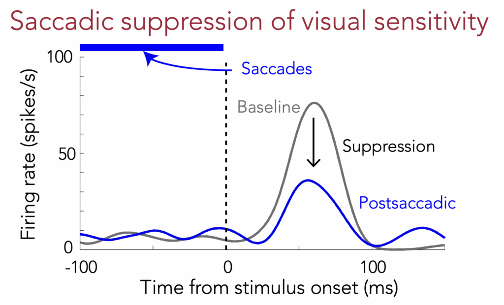 In the second talk by our lab at the conference, Yue spoke about coarse-to-fine image processing in both the SC and V1. By coarse-to-fine, it is meant that she analyzed the timing of visual responses in the two brain areas for images that are either coarse (having low-pass spatial frequency content) or fine (having high-pass spatial frequency content). She found much stronger coarse-to-fine image processing dynamics in the SC than in V1, which is very surprising at first glance. However, when one thinks about it, this result makes perfect sense because we typically employ eye movements to foveate images before visually analyzing them in the foveal parts of the retinal image. So, if the SC accelerates coarse image processing, then this also allows foveation to occur much earlier for peripheral targets, which are already generally more low- than high-pass in terms of their spatial frequency content. This result also reinforces our ideas (like here) that visual responses in the SC are not merely inherited from V1.