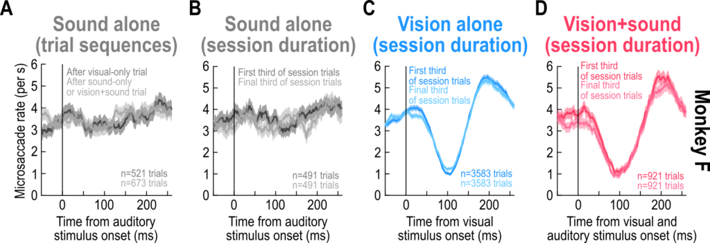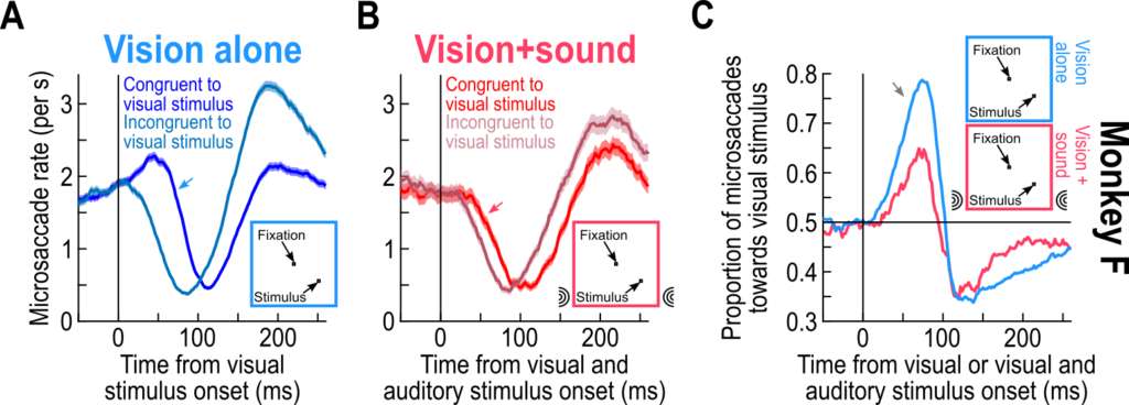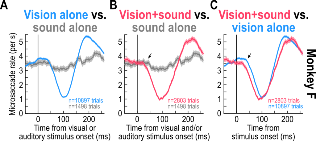 Importantly, we had known for many years that eye movement directions are also altered by visual stimuli (like here and here). When we added the sounds in our experiments, whether these sounds were spatially-uninformative or spatially-lateralized, the visually-driven modulations in eye movement directions persisted. Thus, the visual modality dominates the eye movement directions, but the sound can accelerate temporal aspects of saccadic modulations.