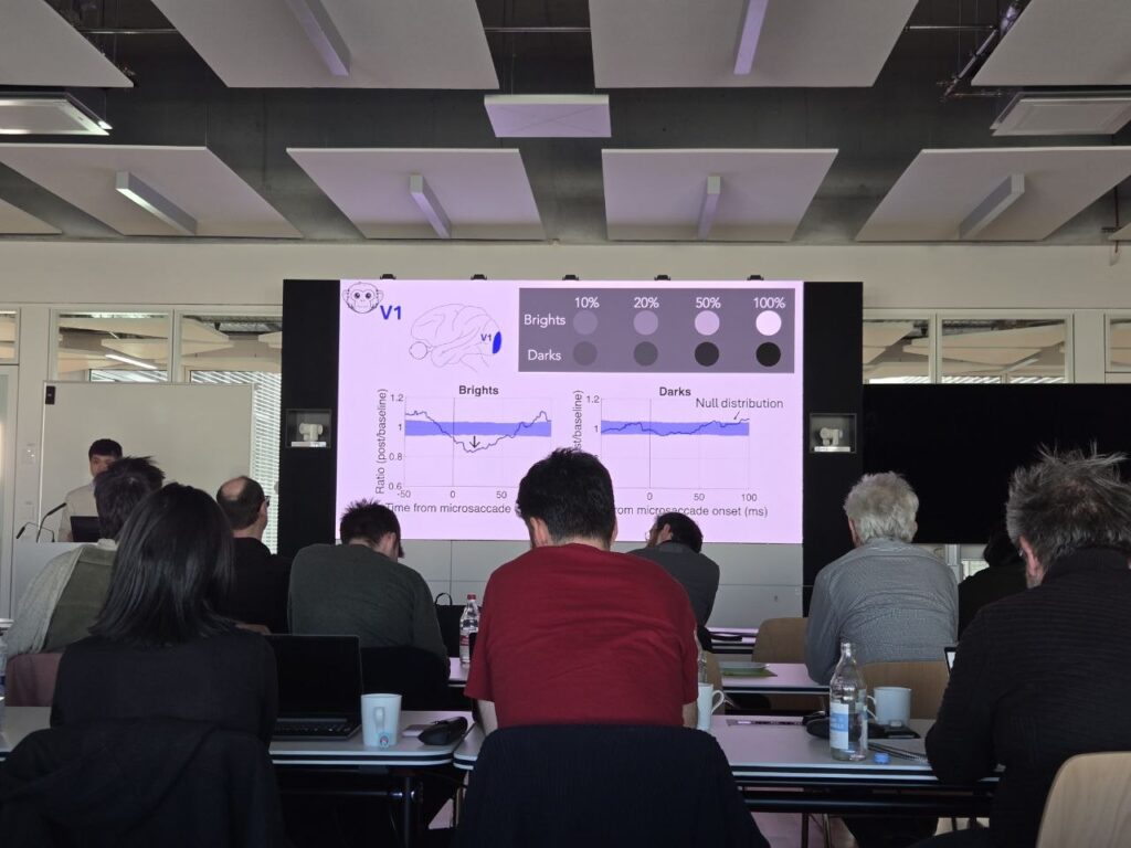 In the second presentation, Wenbin gave a talk about an intriguing perceptual observation related to saccadic suppression. We and others have repeatedly observed that saccadic suppression strength can depend on spatial frequency (like here). However, we also know that this selectivity for a specific range of spatial frequencies can be easily altered and modified. In fact, even within the SC itself, some neurons might be selective for spatial frequency during saccadic suppression epochs and others not (like here). In his new work, Wenbin tried to explore how we can understand the mechanisms underlying saccadic suppression for different spatial frequencies. He first used our neuroscience observations to explore how on and off stimuli can be differentially suppressed by saccades in V1. Then, he developed a model to use this differential suppression to account for spatial frequency selectivity of saccadic suppression. Finally, he tested the limits of the model by doing psychophysics with different image manipulations. The neuroscience and psychophysics gave very intriguing results, but they need to be modeled further for us to better understand the mechanisms underlying them. Once again, he could prove that the selectivity of saccadic suppression for specific ranges of spatial frequencies could easily be modified, and that it is not a hardwired fact of visual processing around the time of saccades. This motivates further studies for understanding how pattern vision is modified under active eye movement conditions. Please stay tuned for further exciting observations by Wenbin!