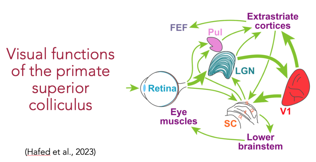 In the first presentation, Ziad described our observations of functional differences between the superior colliculus (SC) and primary visual cortex (V1) in temporally filtering dynamic natural scenes. He also explored the nature of the relationship between the SC and V1 in terms of visual function and anatomy.