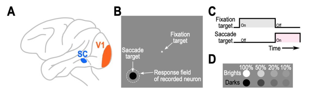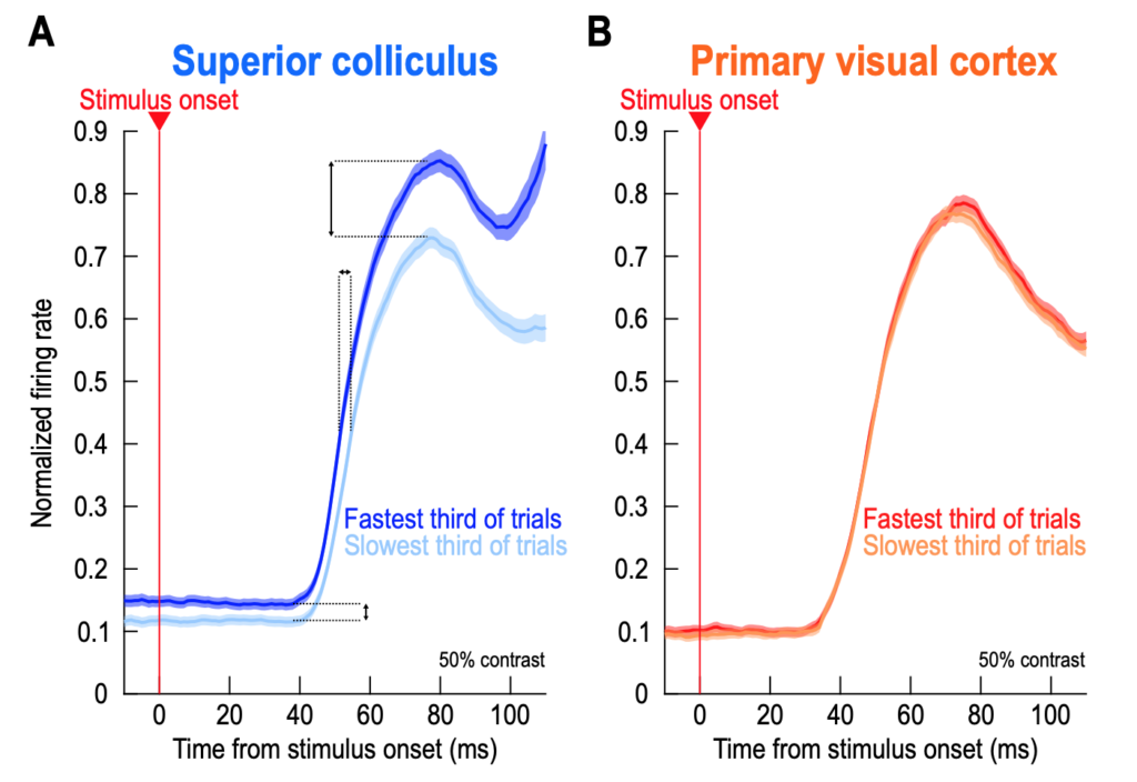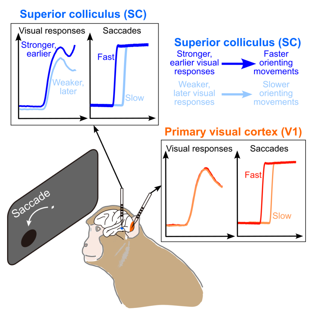 We explored this question by linking visual responses in both brain areas to rapid foveating eye movements that we employ to look at the world around us. Whenever a visual stimulus suddenly appears in the environment, an automatic reflex is usually to directly look at it and bring its image into the foveal region of the retina. Before such a foveating eye movement is triggered, both SC and V1 neurons would exhibit visual responses to the appearing eccentric stimulus, and we asked how the properties of these visual responses correlate with the so-called “saccadic reaction time”. By performing experiments in the very same animals, and with the very same stimuli, but in the two different brain areas, we could directly compare the relative differences between the two areas – without worrying about other confounds like differences in individual subjects, stimuli, or laboratory conditions. Such confounds could not be resolved based on the evidence from the literature so far, and that is exactly why our study was important to conduct.