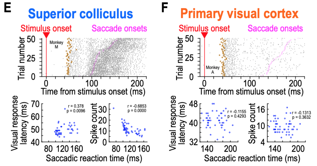 For a variety of different image contrasts and appearances, we found something remarkable: predicting saccadic eye movement reaction time from visual responses on any given trial is much better in the SC than in V1. Thus, SC visual responses are reformatted in a way that helps dictate, at least in part, how quickly a foveating eye movement might be triggered. This is consistent with our earlier hypothesis that the SC might possess what we called “a vision for orienting“, which is not necessarily the case for V1.
