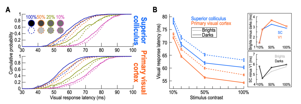 Finally, our paper was the first in the literature to document the average response latencies of V1 and SC neurons in the very same animals and with the very same stimuli. We found that SC visual responses were occurring systematically 5-6 ms later than V1 visual responses (consistent with the direction of anatomical connectivity between V1 and SC), but that differences within an area with different image properties were quantitatively more similar to each other (i.e. the image-dependent differences in visual response latencies were the same regardless of which brain area we were recording from).