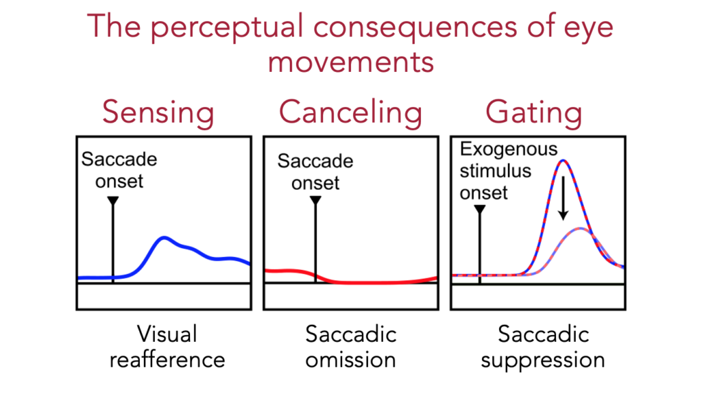 The talk by Ziad involved our studies on the perceptual consequences of rapid eye movements (saccades). In particular, we attempted to dissect the neural mechanisms of classic perceptual observations in human vision around the time of saccades. We did so by exploring two related brain areas, the primary visual cortex (V1) and the superior colliculus (SC), and we investigated aspects like sensing, canceling of spurious retinal motions caused by eyeball rotations, and gating of exogenous stimuli occurring around the time of saccadic eye movement generation. We believe that our results ground more than 30 years of perceptual work on peri-saccadic perception into plausible neural mechanisms, and they also explain which brain areas are more linked to perceptual experience than others. Remarkably, we consistently find that SC effects are much more in line with perception than V1 effects, which raises important questions about the links between V1 and conscious perception (an old idea that lingers until now). As always, we think that there is more nuance to this idea than might be appreciated, and our aim is to keep investigating it further. Our work in Ziad’s talk is also interesting for us because it can touch on broader topics that we mentioned in our recent perspective piece across multiple species and multiple sensory modalities: here.